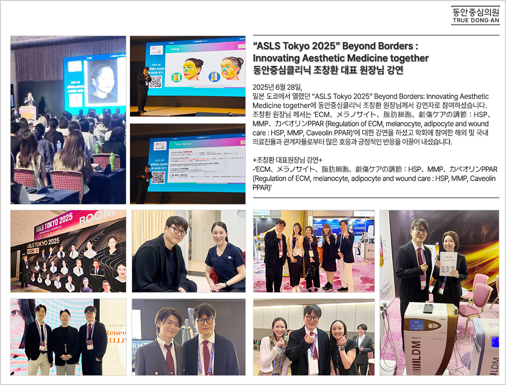 2025년 6월 28일, 일본 도쿄에서 열렸던 “ASLS Tokyo 2025” Beyond Borders: Innovating Aesthetic Medicine together에 동안중심클리닉 조창환 원장님께서 강연자로 참여하셨습니다. 조창환 원장님 께서는 ‘ECM、メラノサイト、脂肪細胞、創傷ケアの調節:HSP、MMP、カベオリンPPAR (Regulation of ECM, melanocyte, adipocyte and wound care : HSP, MMP, Caveolin PPAR)’에 대한 강연을 하셨고 학회에 참여한 해외 및 국내 의료진들과 관계자들로부터 많은 호응과 긍정적인 반응을 이끌어 내셨습니다. +조창환 대표원장님 강연+ -‘ECM、メラノサイト、脂肪細胞、創傷ケアの調節:HSP、MMP、カベオリンPPAR (Regulation of ECM, melanocyte, adipocyte and wound care : HSP, MMP, Caveolin PPAR)’ ![]() |