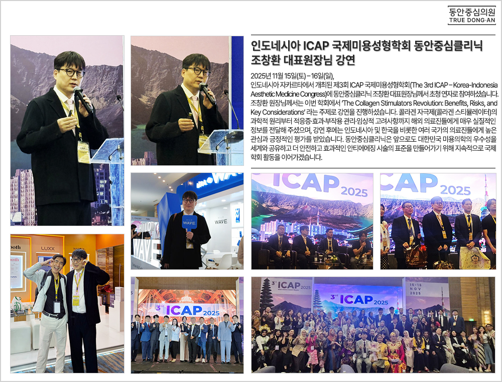 2025년 11월 15일(토) – 16일(일), 인도네시아 자카르타에서 개최된 제3회 ICAP 국제미용성형학회(The 3rd ICAP – Korea-Indonesia Aesthetic Medicine Congress)에 동안중심클리닉 조창환 대표원장님께서 초청 연자로 참여하셨습니다. 조창환 원장님께서는 이번 학회에서 ‘The Collagen Stimulators Revolution: Benefits, Risks, and Key Considerations’ 라는 주제로 강연을 진행하셨습니다. 콜라겐 자극제(콜라겐 스티뮬레이터)의 과학적 원리부터 적응증·효과·부작용 관리·임상적 고려사항까지 해외 의료진들에게 매우 실질적인 정보를 전달해 주셨으며, 강연 후에는 인도네시아 및 한국을 비롯한 여러 국가의 의료진들에게 높은 관심과 긍정적인 평가를 받았습니다. 동안중심클리닉은 앞으로도 대한민국 미용의학의 우수성을 세계와 공유하고 더 안전하고 효과적인 안티에에징 시술의 표준을 만들어가기 위해 지속적으로 국제 학회 활동을 이어가겠습니다. ![]() |