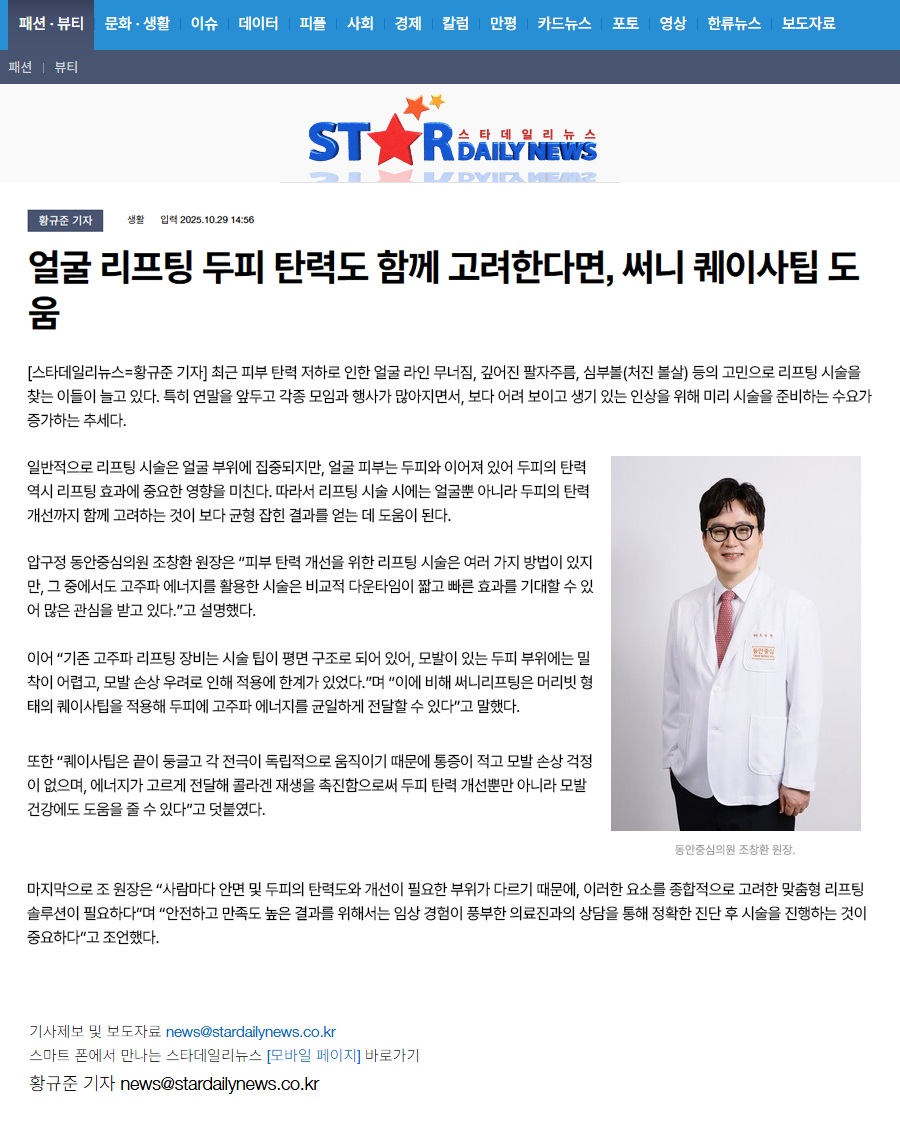동안중심의원 조창환 원장은 “진정한 리프팅은 얼굴만이 아니라 두피 탄력까지 함께 관리할 때 완성된다”고 말했다. 두피의 탄력이 떨어지면 이마·눈썹·턱선 등 얼굴 전반의 처짐으로 이어질 수 있기 때문이다. 동안중심은 이러한 원리를 바탕으로‘써니 퀘이사팁’을 활용한 두피 리프팅 케어를 도입했다. 미세 진동과 열에너지를 통해 두피 순환을 개선하고, 얼굴 하부 라인까지 자연스럽게 끌어올리는 시술이다. 조창환 원장은 “두피와 얼굴을 동시에 케어하는 것이 자연스럽고 조화로운 동안 효과를 만드는 핵심”이라고 강조했다. 보도자료 원문바로가기 ![]() |